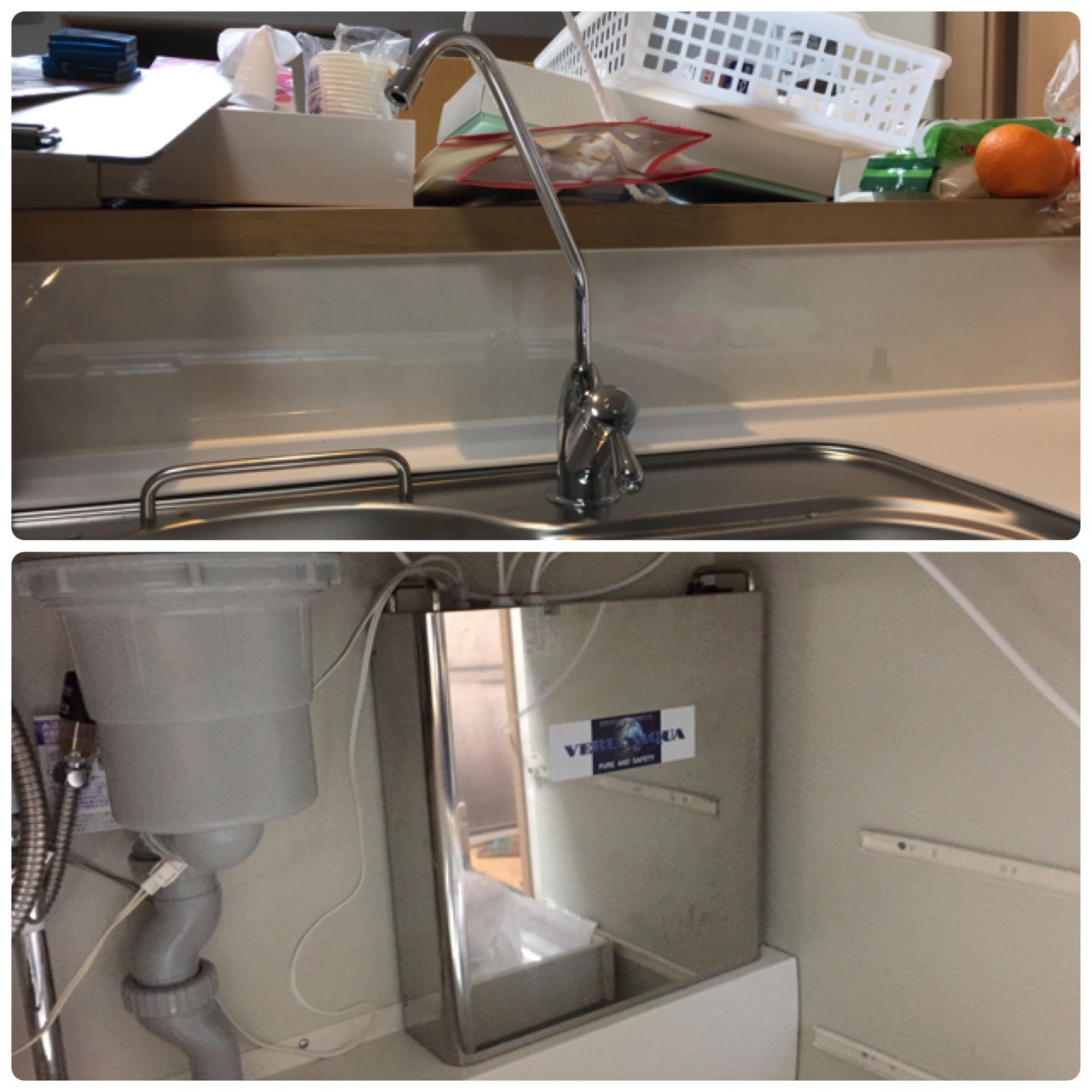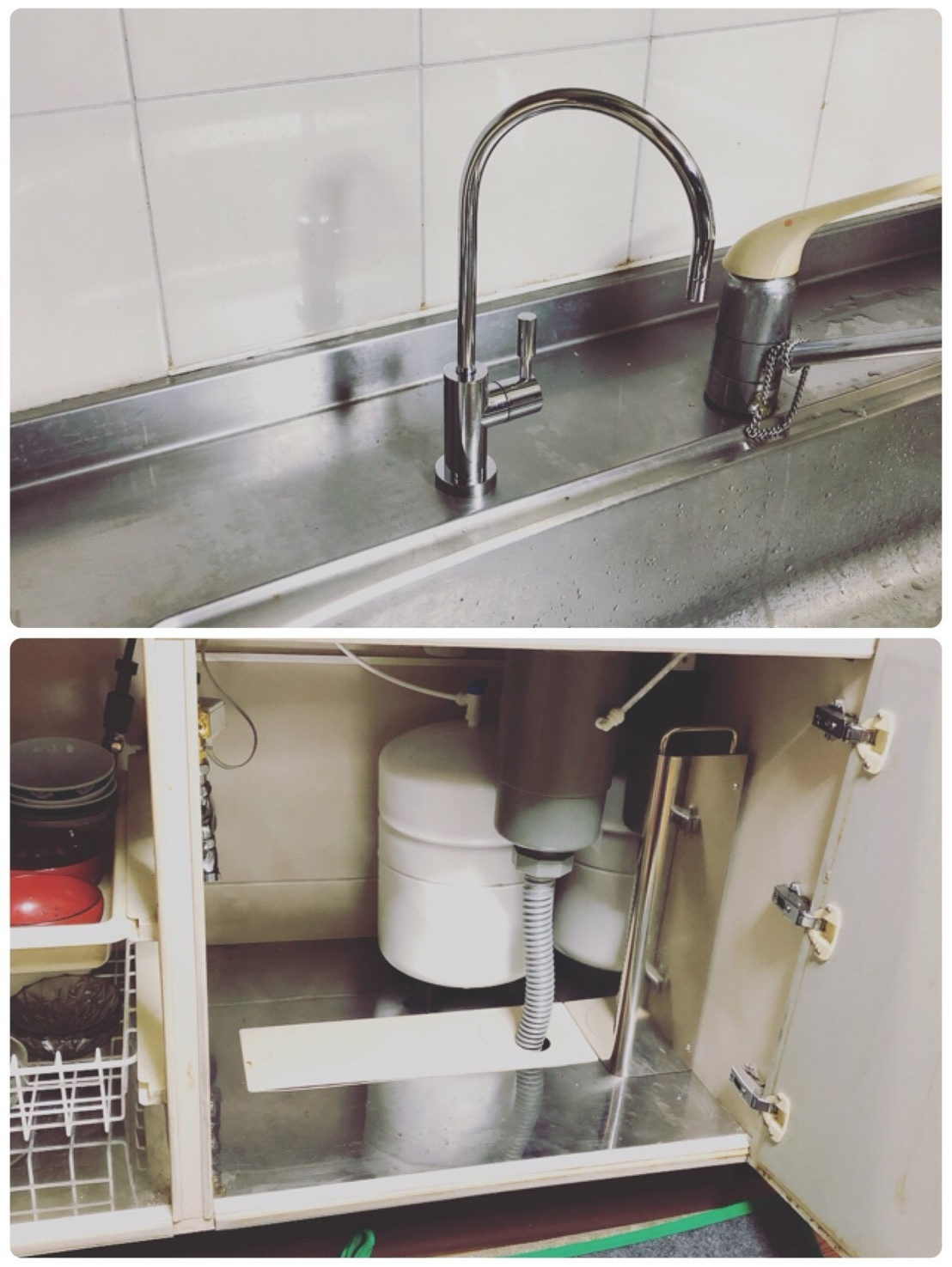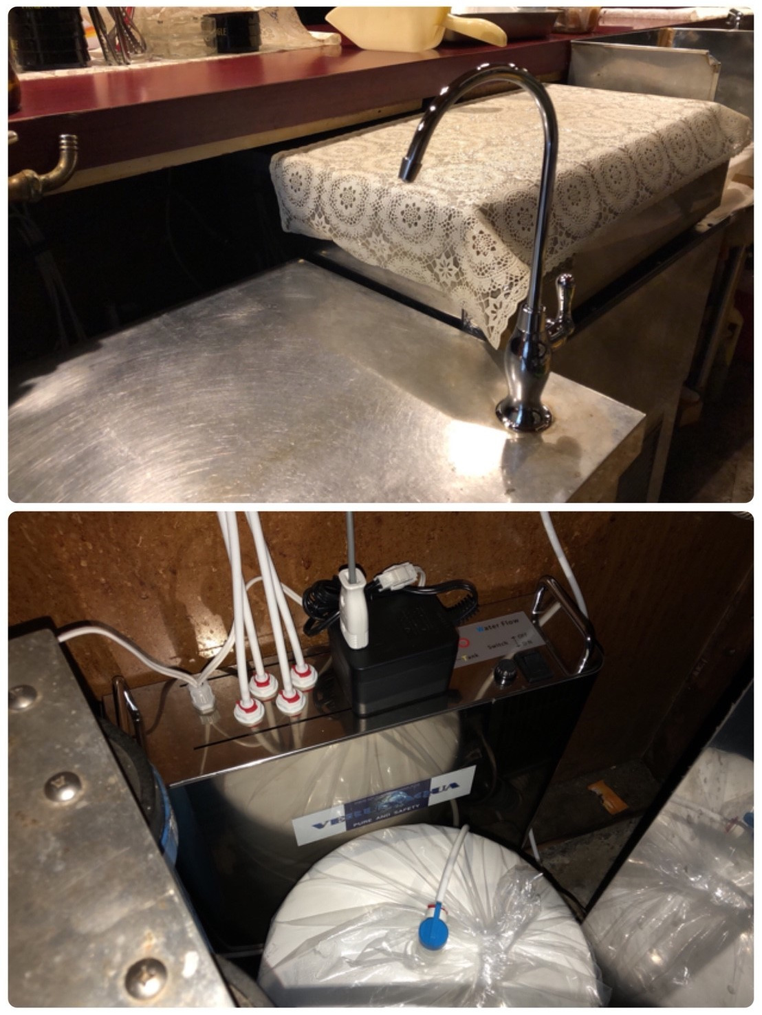 今回は料理店さんの厨房へ設置させて頂きました。穴を空ける等の工事が出来ないということで、置き型の蛇口を使用しております。美味しい料理やお水をお客様に出せると言って頂けたのでうれしいです^^是非、今度お食事に行かせて頂きたいと思います!今後ともよろしくお願い致します!