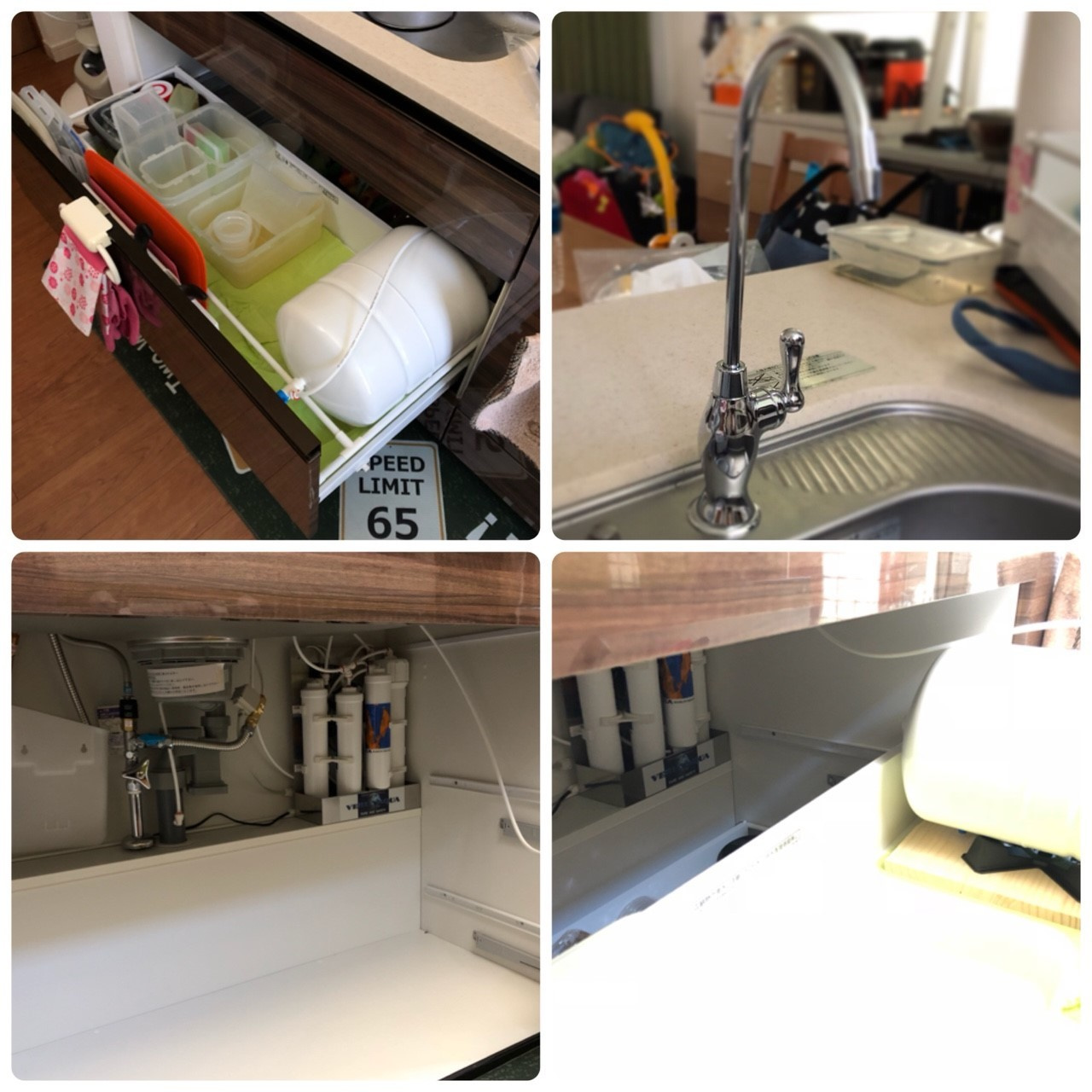 今回は、逆浸透膜浄水器とシャワー浄水器、洗面台に設置させて頂きました。浄水器本体は引出し奥壁面にピタッと置くことが出来ました。RO水用の蛇口はご使用中の他社製浄水器用蛇口を外し、その穴を利用して取り付けてあります。蛇口の写真は撮り忘れてしまいました><ちなみに引き出し式システムキッチンの時は、浄水器のON/OFFを簡単にできるように手前にスイッチを取り付けています。今後ともよろしくお願いいたします。