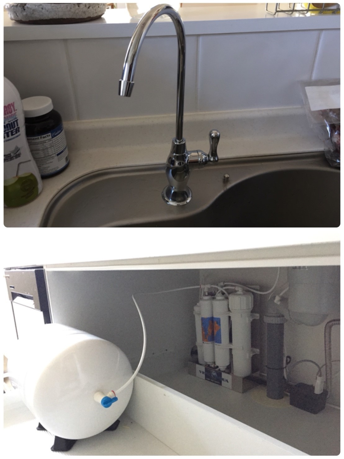 古くなった浄水器をベラスアクアRO浄水器に買い替えて頂きました。キッチン裏手の収納の中にタンクと本体を設置してあります。壁面に穴があけチューブを通してあります。今後ともよろしくお願いいたします。
